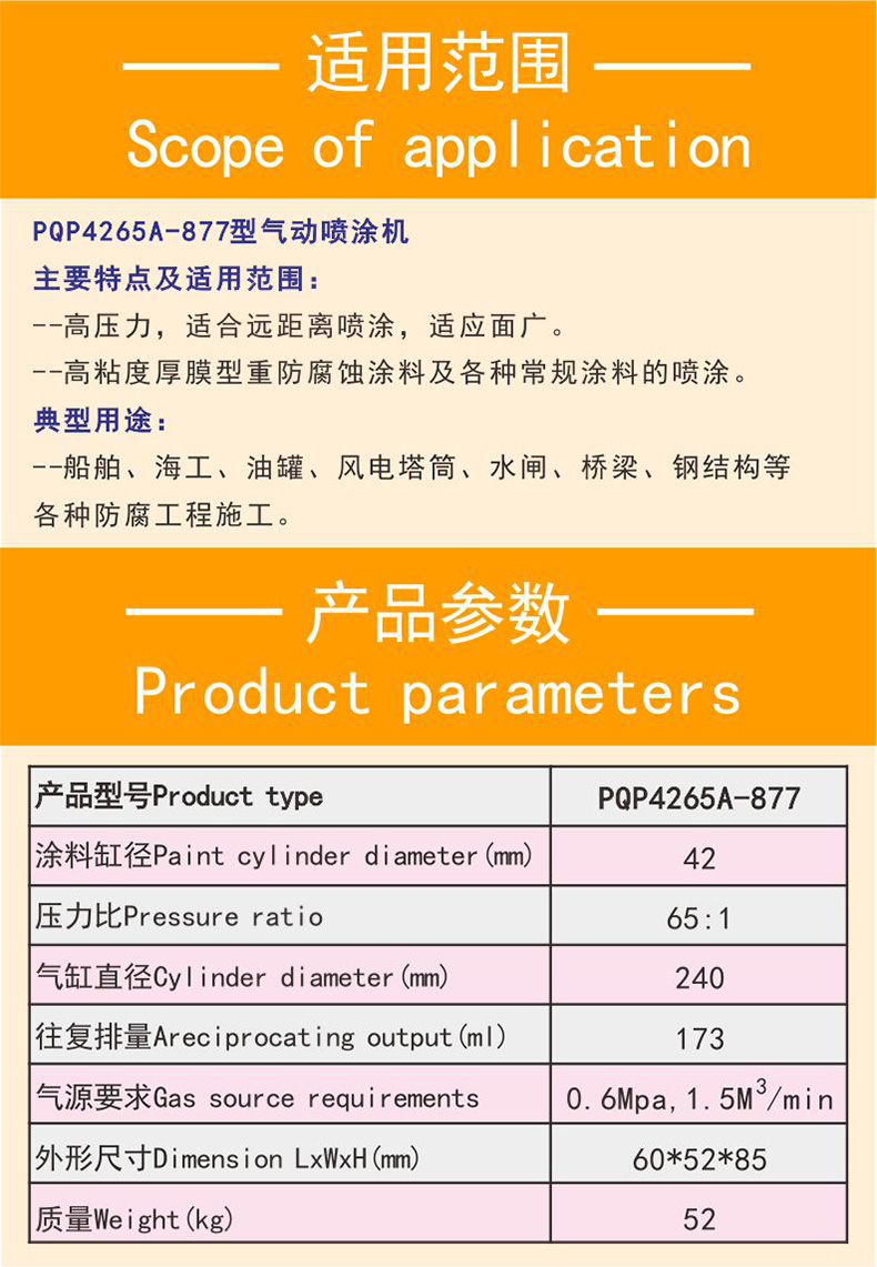 主要特点及适用范围: ----高压力,适合远距离喷涂,适应面广。 ----高粘度厚膜型重防腐蚀涂料及各种常规涂料的喷涂。 典型用途: ----船舶、海工、油罐、风电塔筒、水闸、桥梁、钢结构等各种防腐工程施工。 技术参数: 涂料缸径:42mm -------- 压力比65:1 ------ 气缸直径:240mm --------- 往复排量:173ml