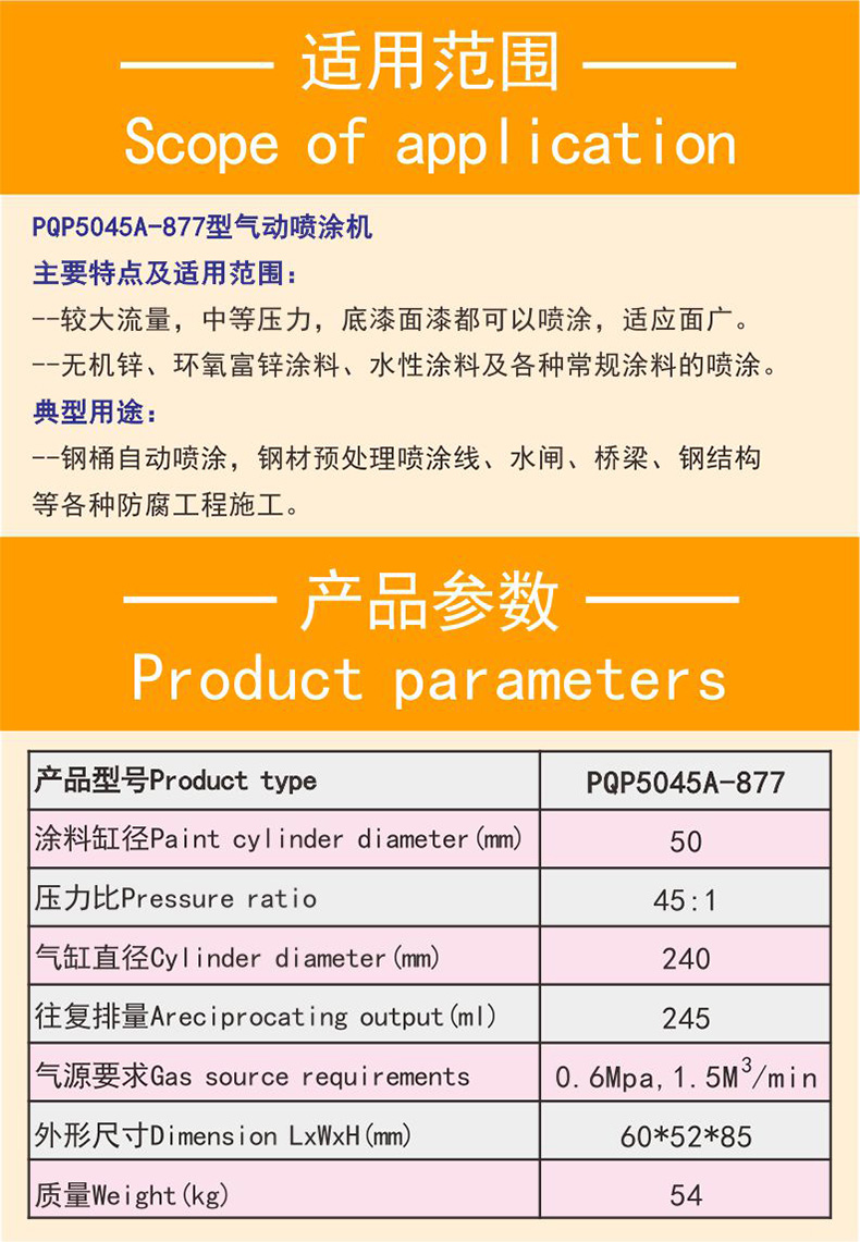 主要特点及适用范围: ----较大流量,中等压力,底漆面漆都可以喷涂,适应面广。 ----无机锌、环氧富锌涂料、水性涂料及各种常规涂料的喷涂。 典型用途: ----钢桶自动喷涂,钢材预处理喷涂线、水闸、桥梁、钢结构等各种防腐工程施工。