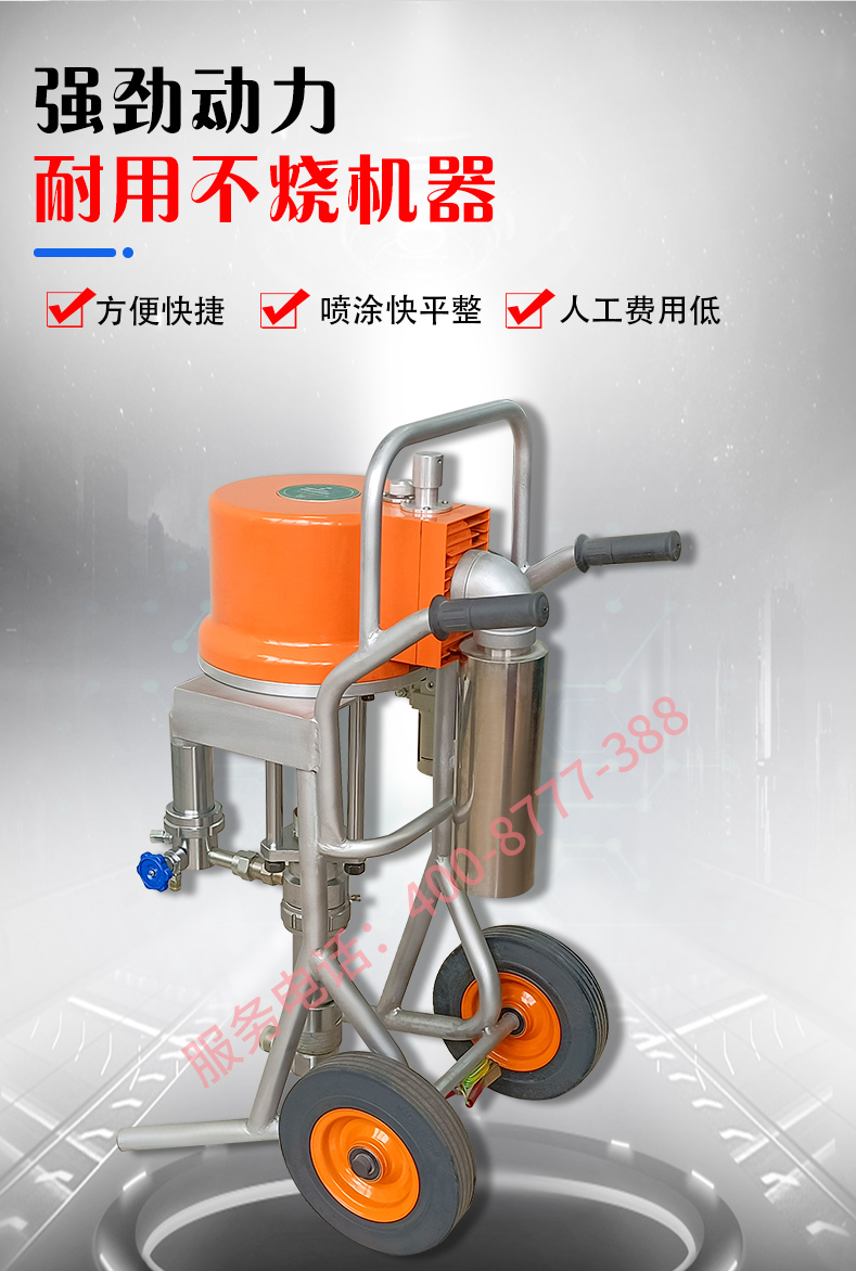主要特点及适用范围: ----高压力,较大流量,底漆面漆都可以喷涂,适应面广。 ----高粘度厚膜型重防腐蚀涂料及各种常规涂料的喷涂。 典型用途: ----船舶、海工、油罐、风电塔筒、水闸、桥梁、钢结构等各种防腐工程施工。